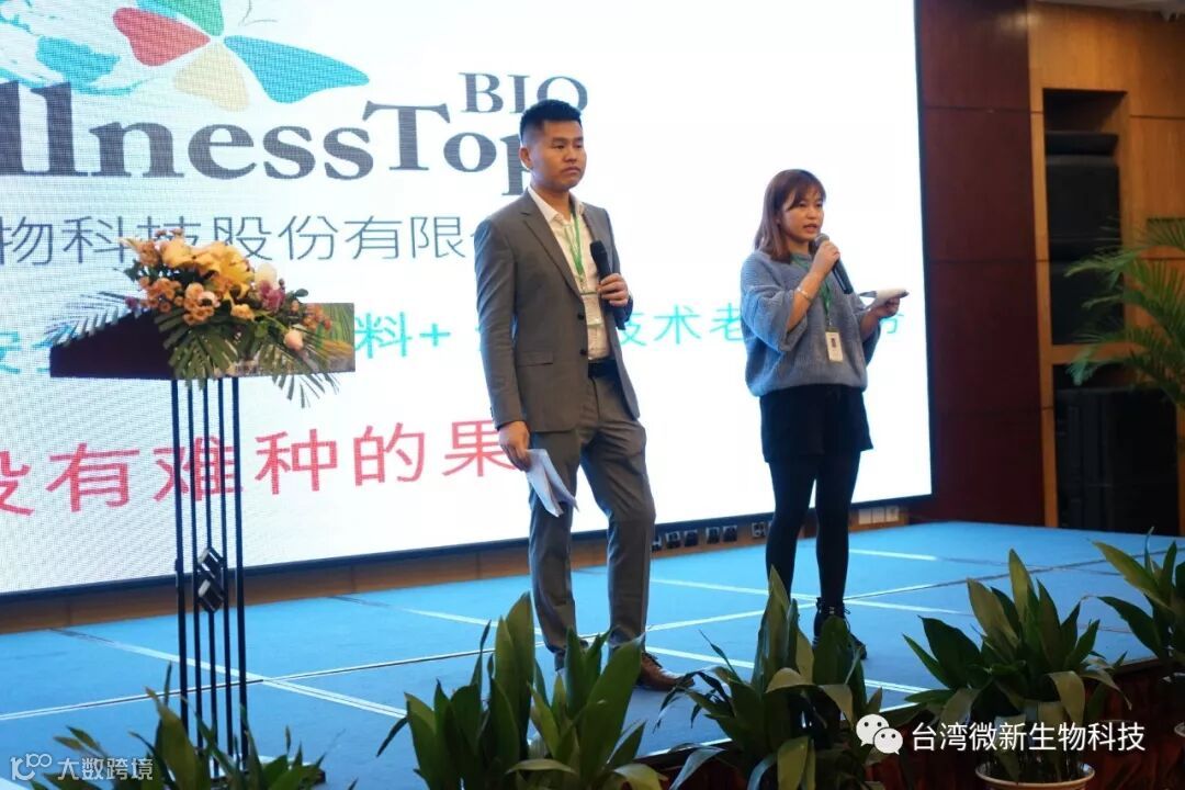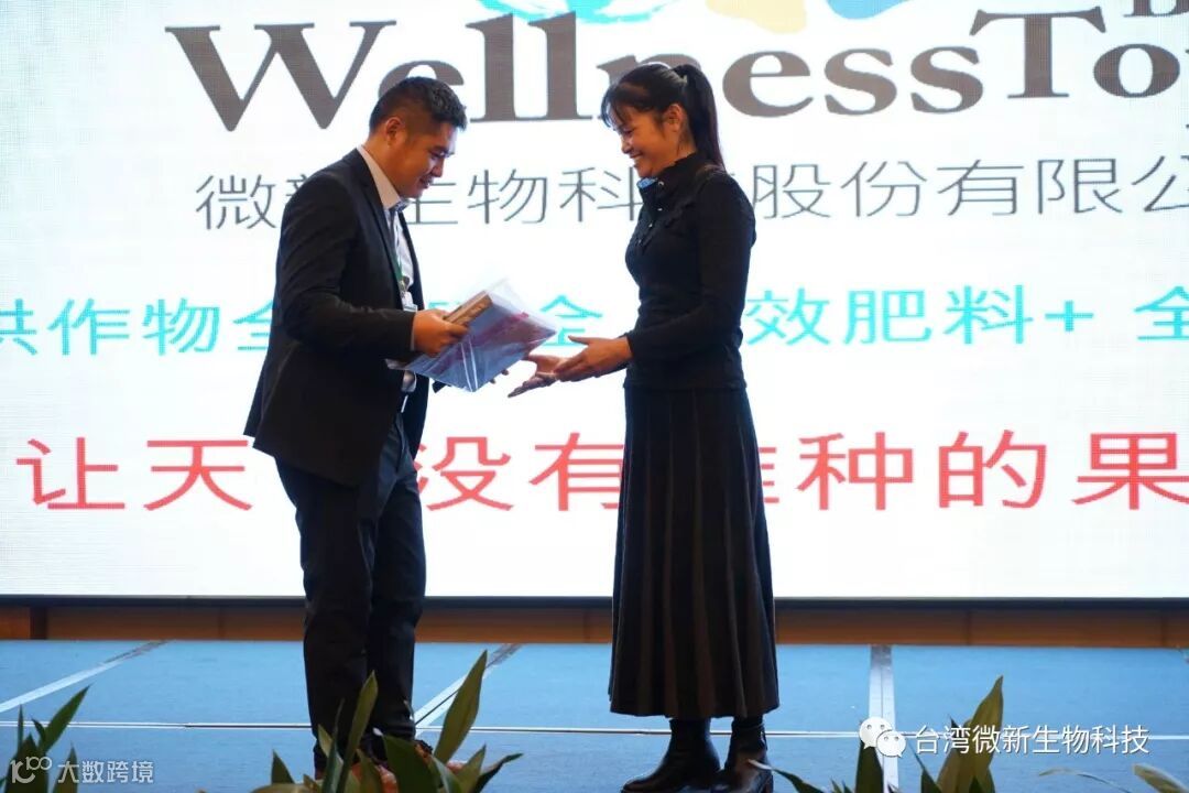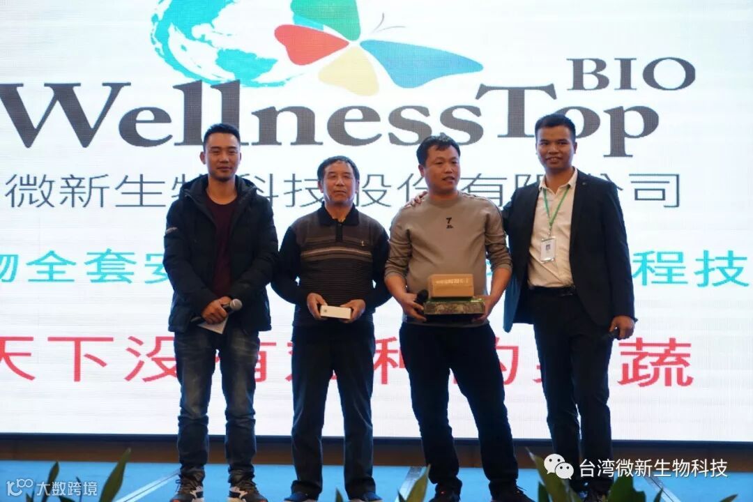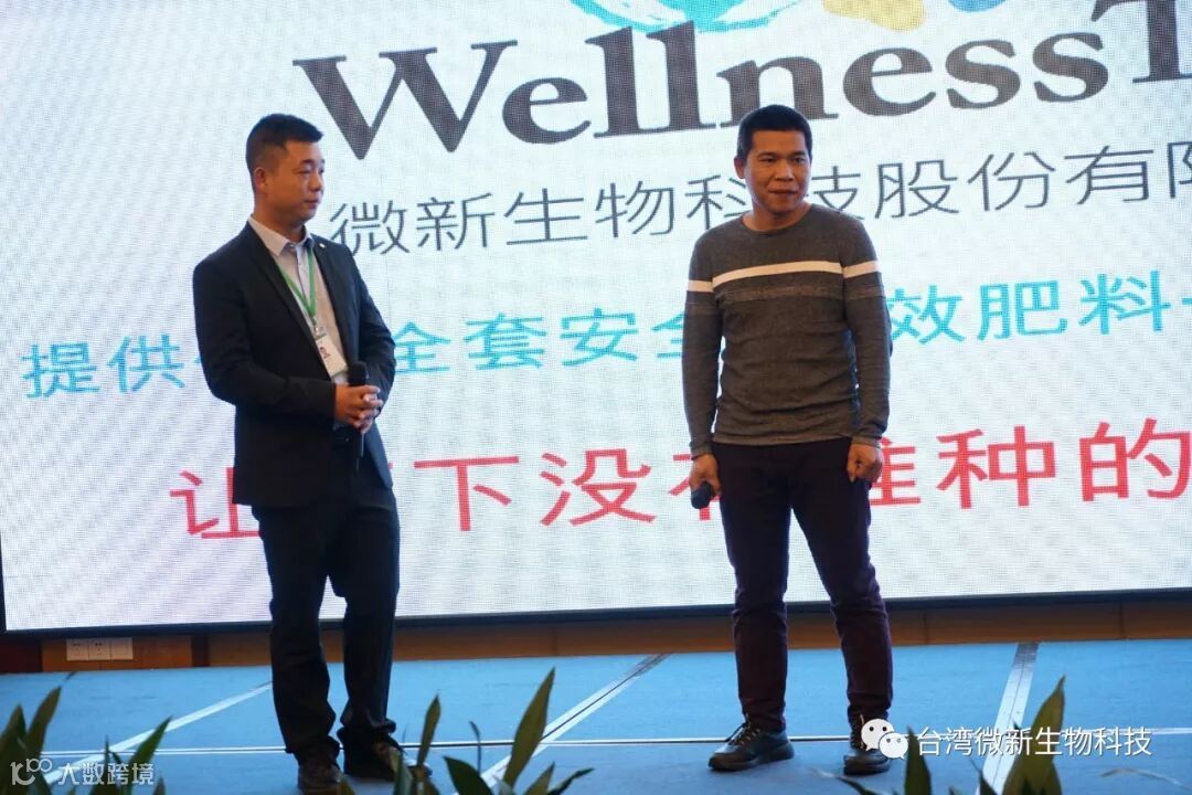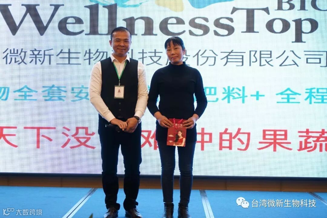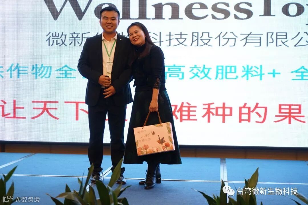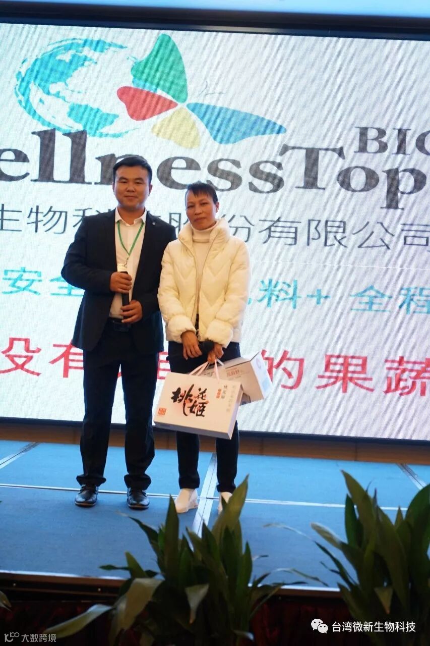 潘老师的感言;我非常的感谢廖涌杰夫妇,对微新生物的支持,他们是我在象州下乡开发市场的第一个客户,打造出来的第一个观摩园,每天在气温高达37~38℃环境下做示范实验,我一吃饱中午饭我就拉廖老板下乡,他都向王总诉苦说:“你的潘总都不给我小眯一会儿就要拉我下乡去了”。廖老板的鞋都被我磨烂了几双,人晒成了别人眼里“你是烧炭的还是出瑶,他的客户都亲切的称呼他为“廖黑子”了,有一次刚下完大雨我们下乡去陆来丰的果园。车差不多到果园时陷进了泥坑,我想一脚油门冲出来,却磨破了轮胎,轮子都漏气完了,当你看到我的一脸的沮丧,你对我说,潘总不急这个我来弄,在这个烂泥坑里,你三下两下就把车轮换好,还有很多让我很感动的事迹太多了,让我今天在台上无叙说太多,你看巫蒙燕女士从一个只是从只坐店的老娘,来了一个人生的180度大转弯变成了早出晚归,风里来雨里去的为果农把关守护的植物医生,借这次机会向廖涌杰先生跟巫蒙燕女士深深的表达我的感谢。