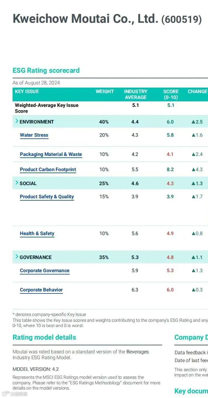 贵州茅台在MSCI ESG评级中跃升两级至BBB级,目前为中国白酒行业最高评级,5.7分是中国内地蒸馏酒与葡萄酒行业最高得分,在中国内地饮料行业排名第3。