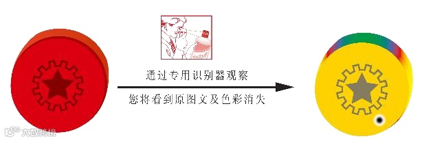 肉眼观察帽套顶部,帽顶外观为亚光红色圆形,在圆形中央有亚光红色烫金图案。通过专用识别器观察,可见帽顶部呈亮黄色,上有黑色浮点,可随帽套的转动在亮黄色背景范围内漂移。