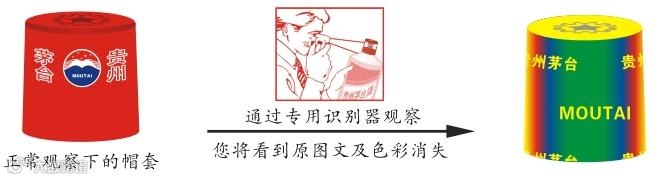 通过专用识别器观察,帽套表面图文消失,出现彩虹状背景和黄色“贵州茅台”和“MOUTAI”文字。