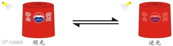 手持茅台酒瓶直接肉眼观察防伪帽套:在顺光方向,茅台logo图文为明亮的珠光增强色。逆光方向,该图文色彩明显变淡。