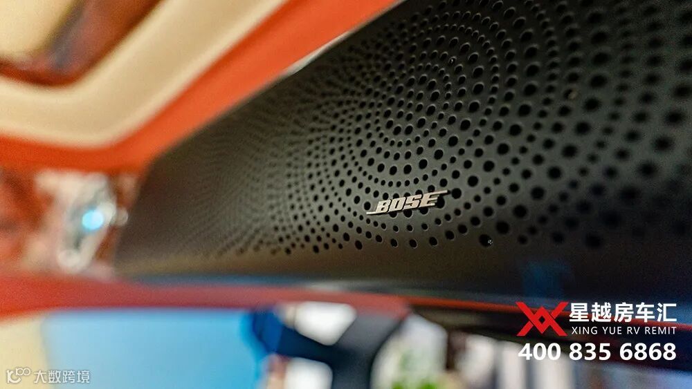 超宽的横屏电视,左右两侧有时速、钟表等信息,并搭配的BOSE音响,在整个降噪处理之后的内舱,听音乐看电视也可以很享受,这也正是高端商务车才有体验。