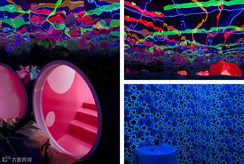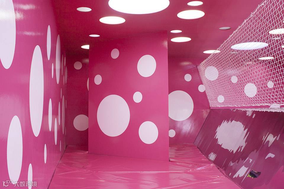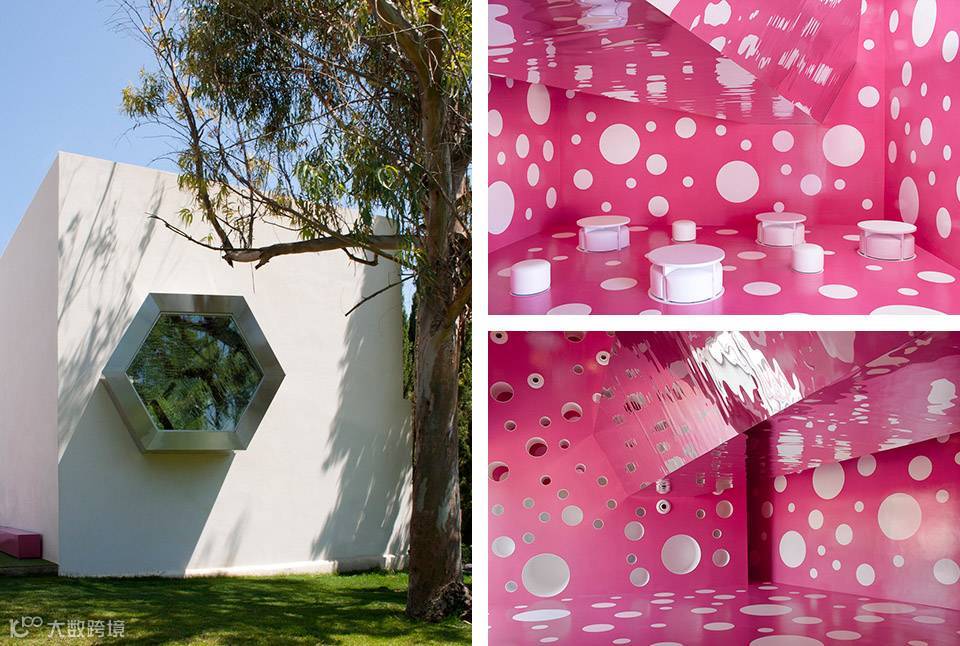 万花筒外面的空间是一个粉色背景的圆点世界,白色的圆点不全是装饰,部分也有照明,储藏等功能。此外还有浴室、楼梯、潜望房以及神秘房等等各有千秋的感官体验空间,这些空间色彩、纹理、反射和氛围都千差万别。是一个多风貌却极为统一的“梦世界”。