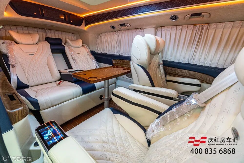 后排还可以放置一个可拆卸的办公桌,需要用的时候安装好即可在这办公,也可用来放置一些美食,饮品。如果是作为商务接待的话,中排旋转过来,与后排形成一个对坐模式,开会洽谈,交流起来非常方便。
