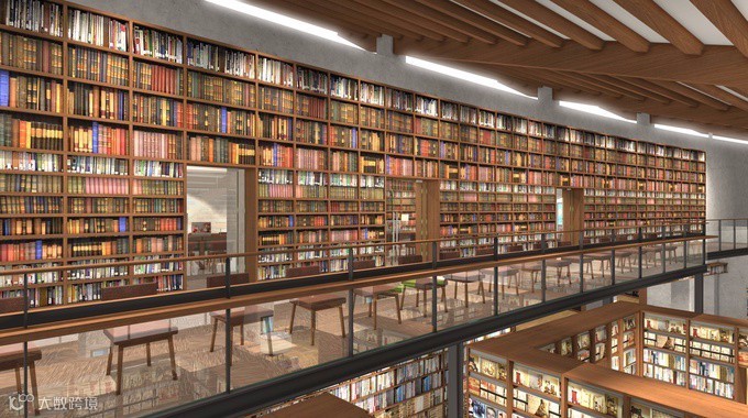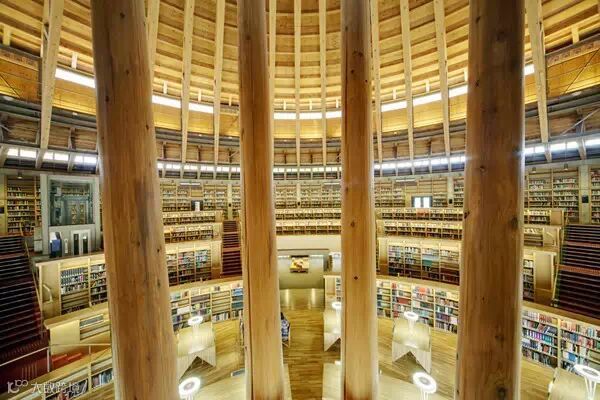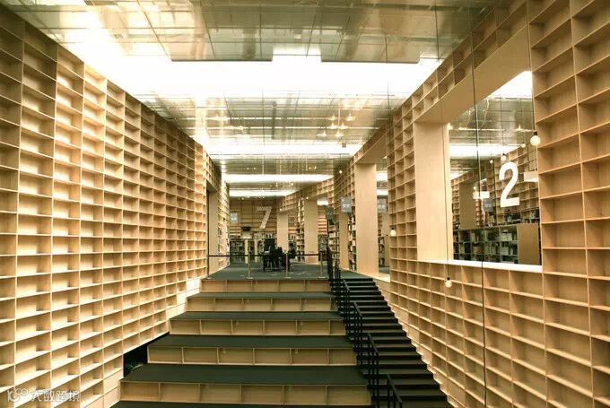 这座6,500平方米的两层建筑,共有20万册藏书。若从上面俯视全馆,满目的书架就变成了螺旋,形成了一个如迷宫般的空间。