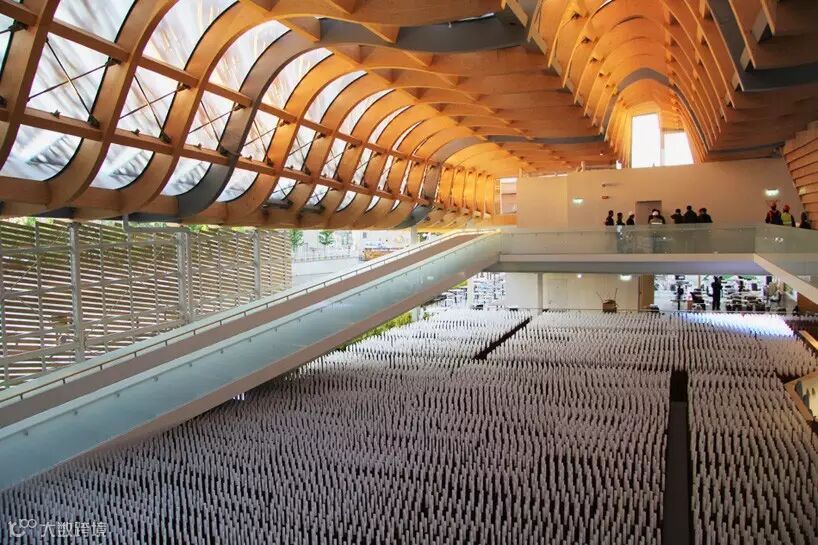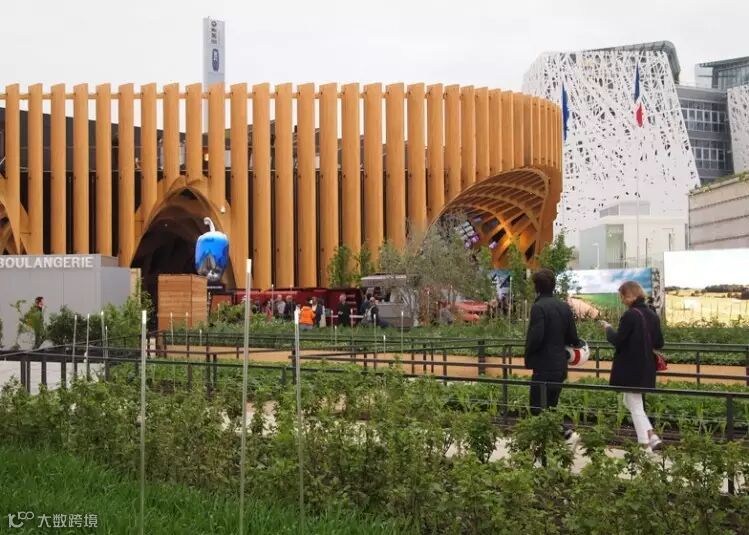 法国馆采用数字制造科技,多层次的木原料创造出山脊状结构。弧形中空区域为室内空间,设计师希望啤酒花植物能够顺着格栅向上生长。