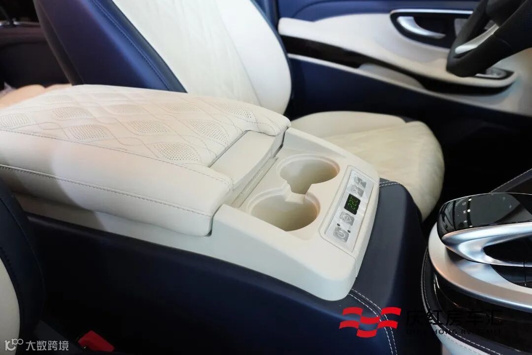 驾驶舱座椅中间扶手箱升级为一个车载冰箱,前端设有两个杯槽,方便驾乘者放置饮料。