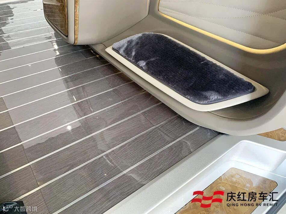高级灰的游艇木地板上设计了脚拖,上面铺垫一层软软的毛毯,减轻腿部的支撑,长时间乘坐也不会觉得累。
