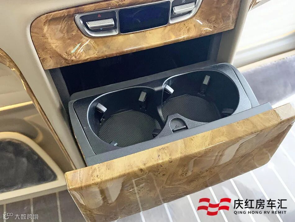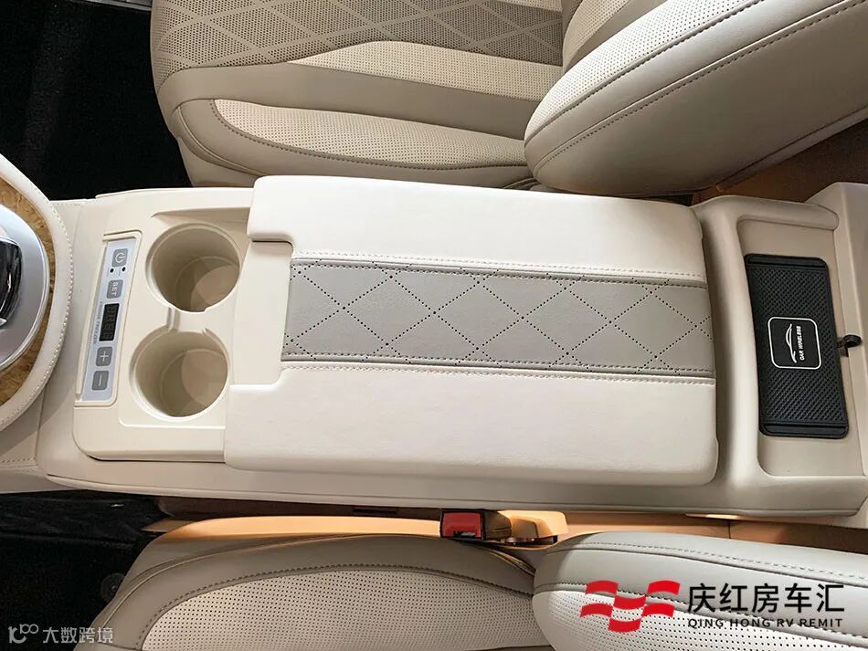 驾驶舱一改黑色的配色,采用香槟金与米白色结合,大面积香槟金的实木饰板包覆中控台。扶手处加装了大容量的车载冰箱,夏日出行途中冷饮随手可得!