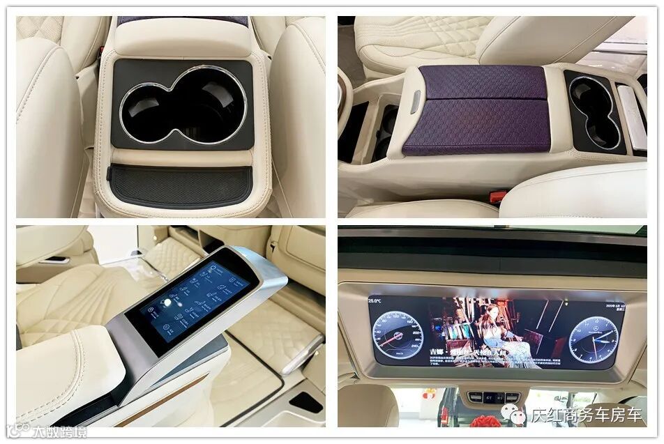 奔驰VS680L驾驶舱仪表台被一整块的枫木饰板所替换,仪表台上方及主副驾驶座椅均升级为纳加拉丝皮包裹,扶手处用Gucci皮包裹着车载冰箱,后侧设计恒温杯托,为夏天的到来考虑周全!