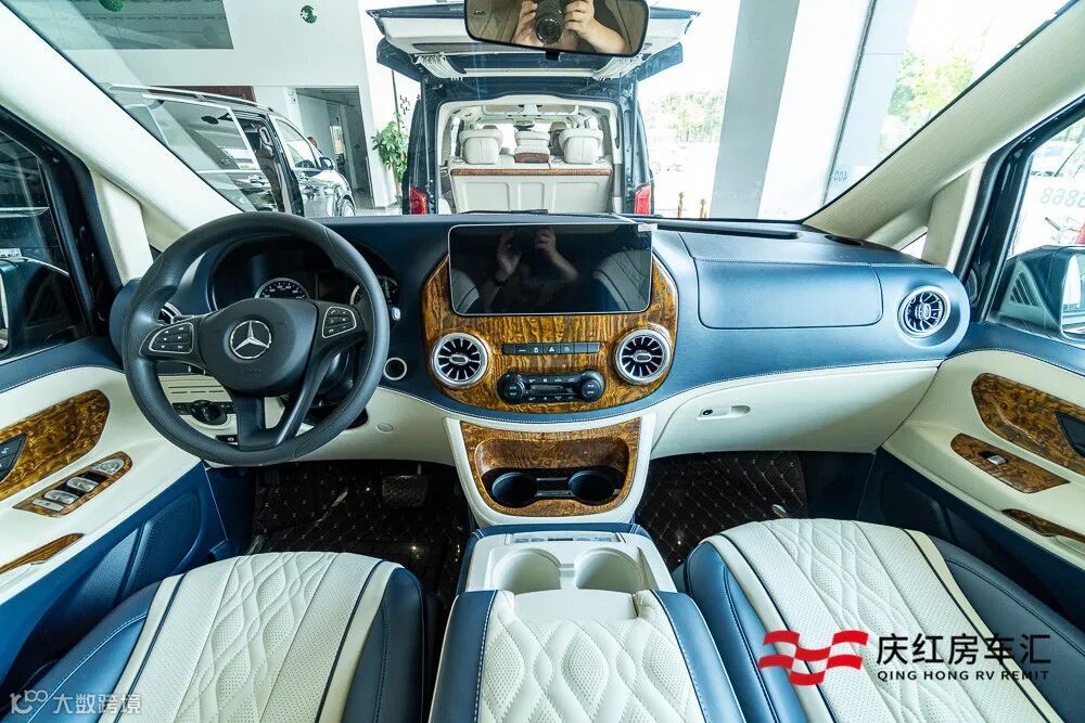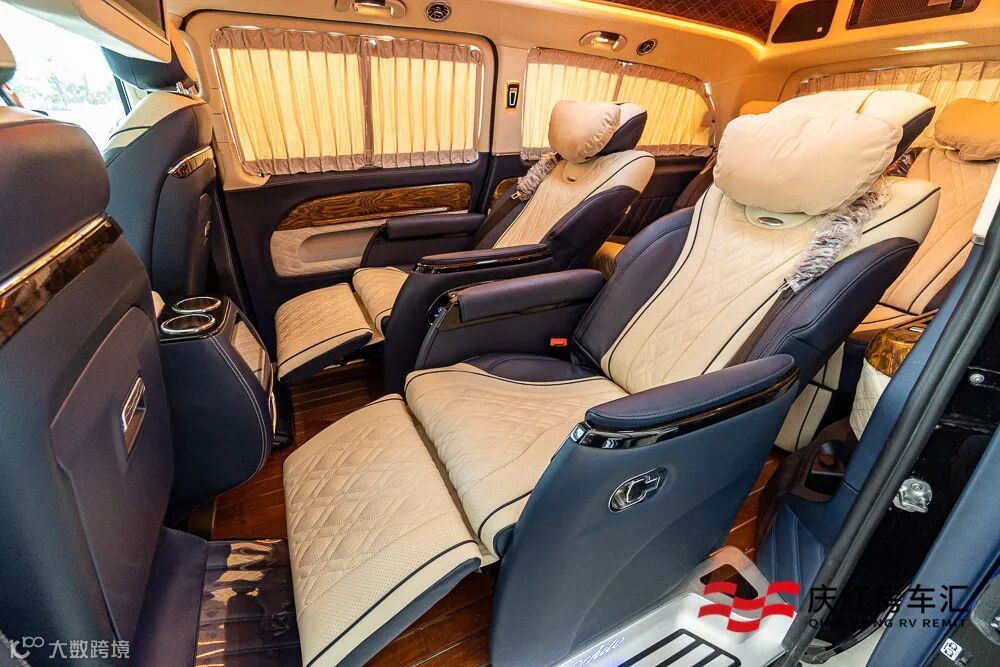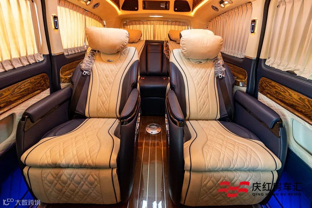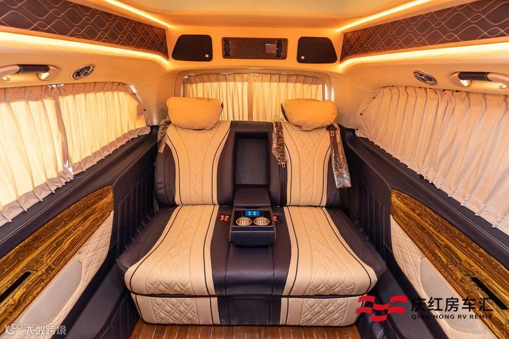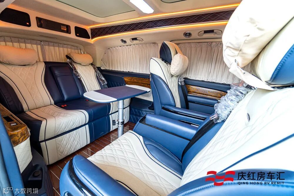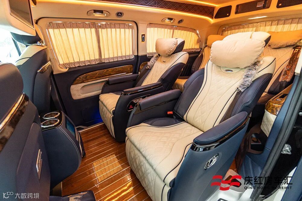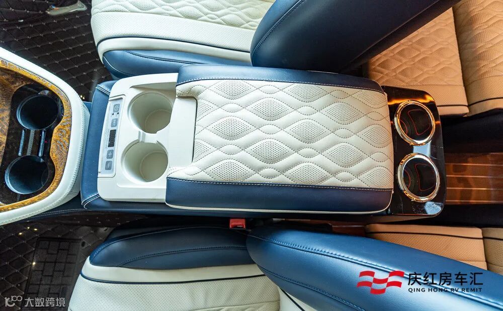 内饰方面,奔驰威霆跟原车的风格可以用天差地别来形容。桃木装饰中控台,蓝白的打孔真皮包覆的内舱,清新高雅。加上扶手处还加装了车载冰箱,整体的质感比原车好太多了!