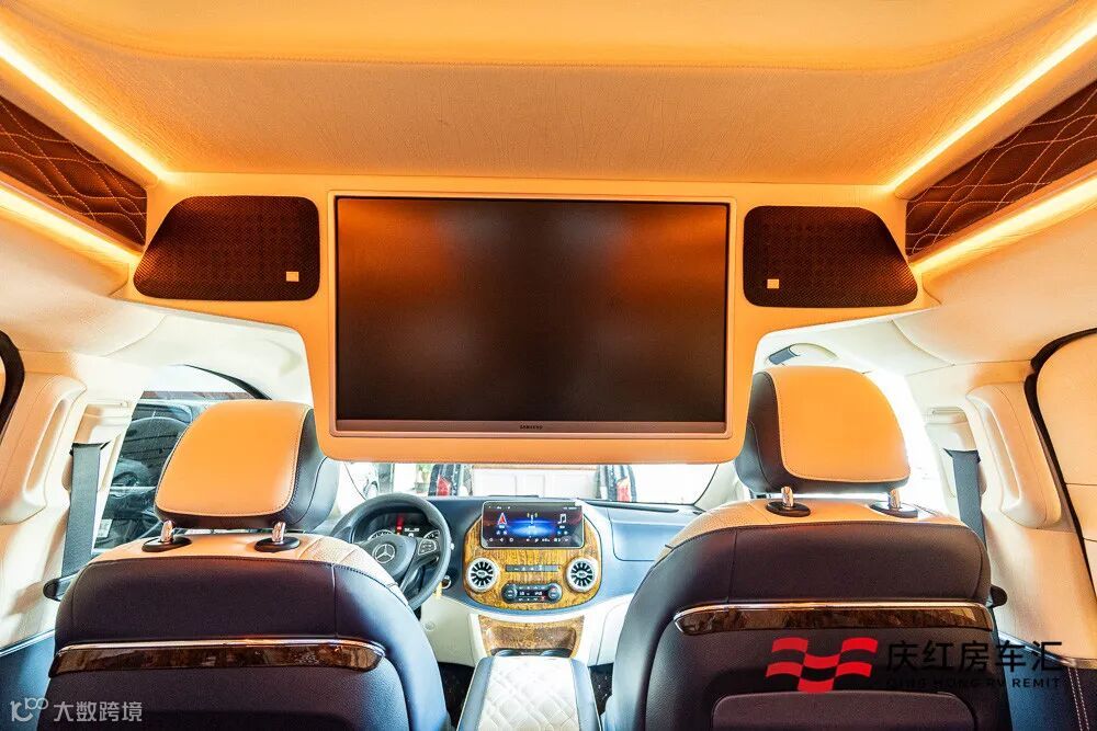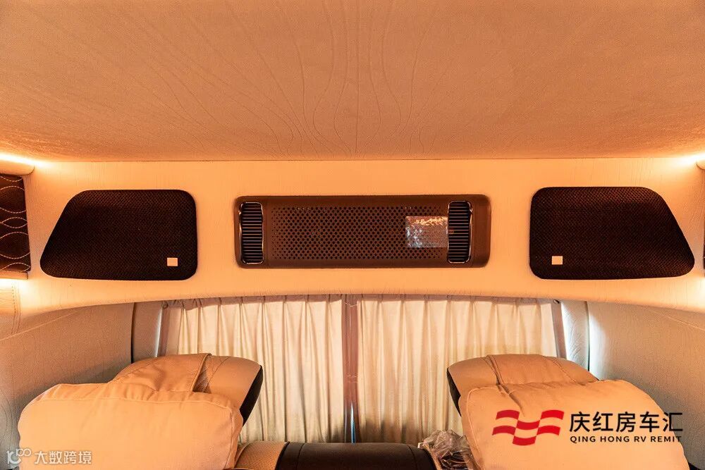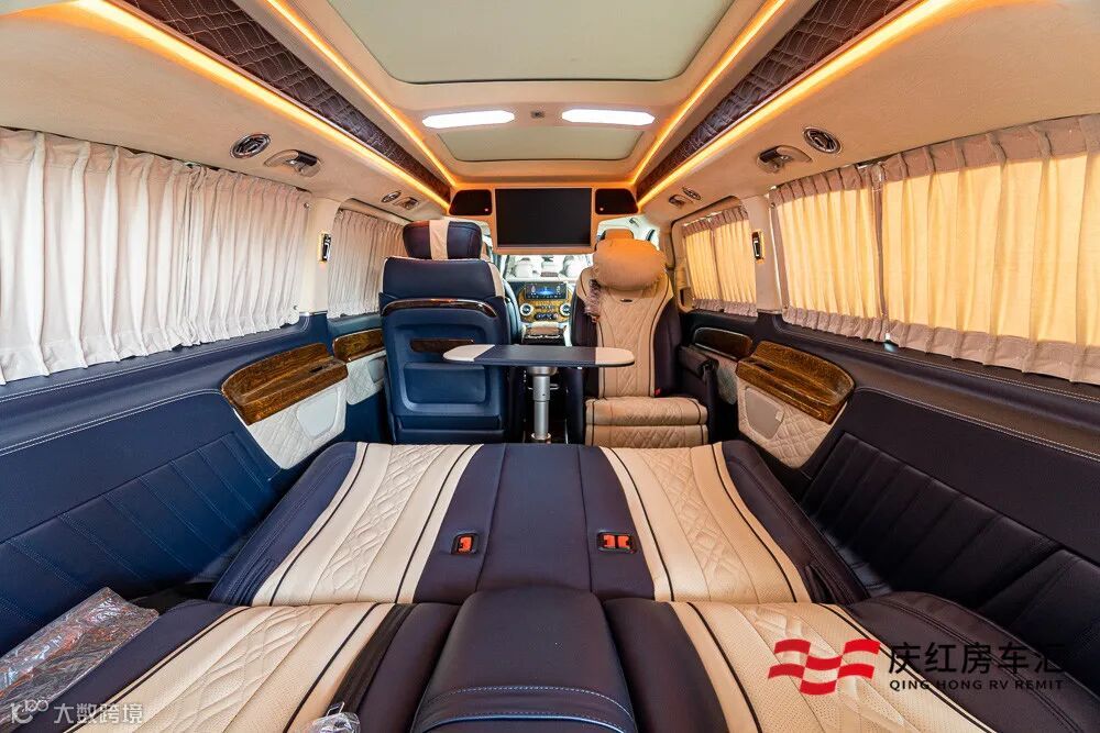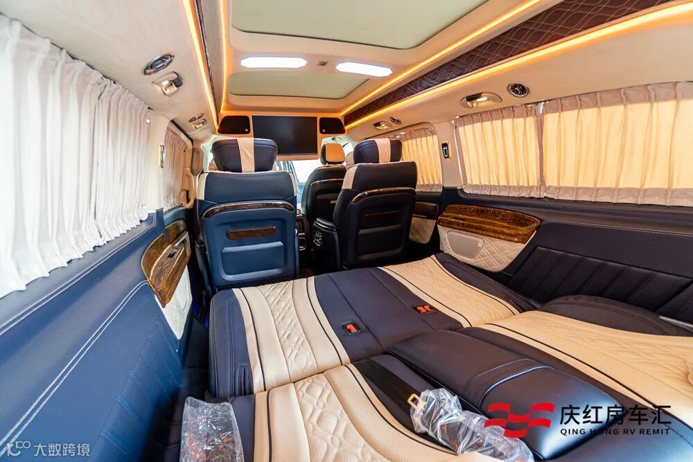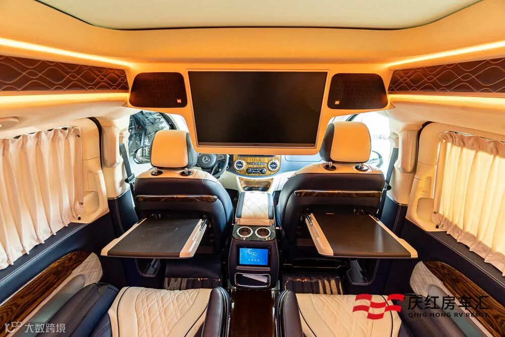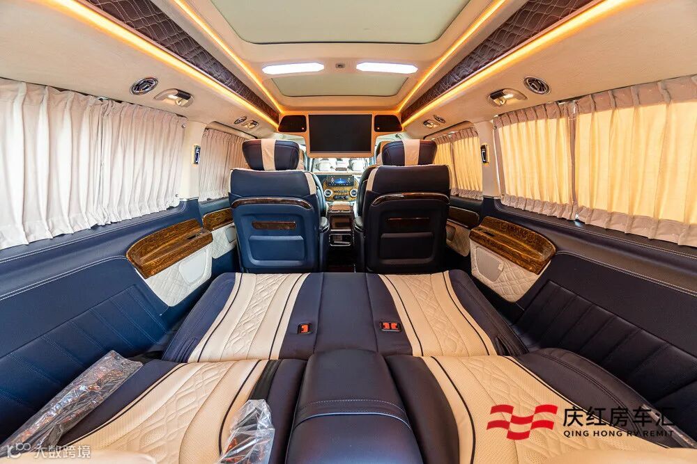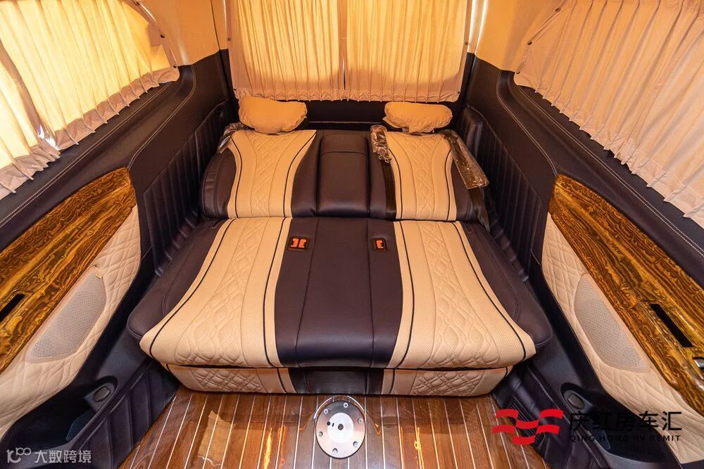 内饰方面,奔驰威霆跟原车的风格可以用天差地别来形容。桃木装饰中控台,蓝白的打孔真皮包覆的内舱,清新高雅。加上扶手处还加装了车载冰箱,整体的质感比原车好太多了!