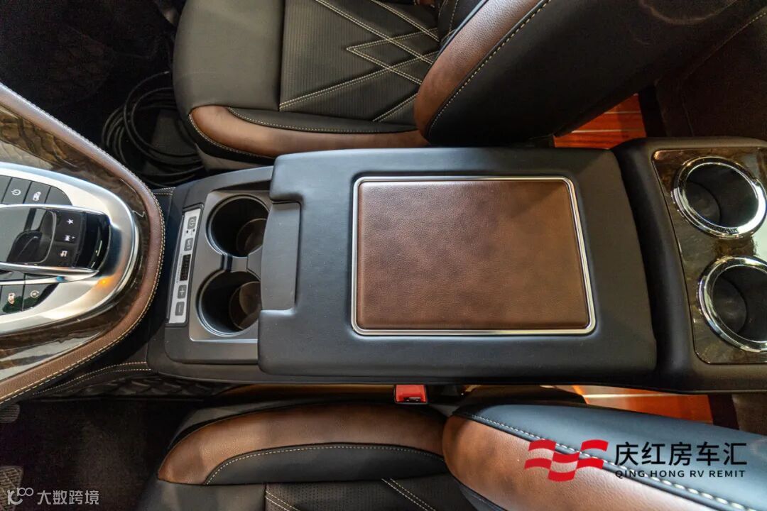 中央一体式真皮扶手箱前后均配备杯托,内含车载冰箱,炎热的夏季能随时喝到冰镇的饮料。