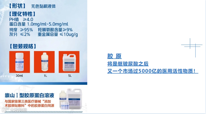 崇山Ⅰ型胶原蛋白原料(溶液)由崇山生物生产,可广泛应用于械、妆、消、食、药等领域,具有极高的开发价值。