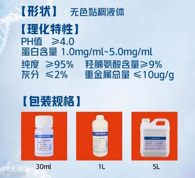保湿性:Ⅰ型胶原蛋白中富含的甘氨酸、羟脯氨酸、丙氨酸等游离氨基酸都是天然保湿因子;