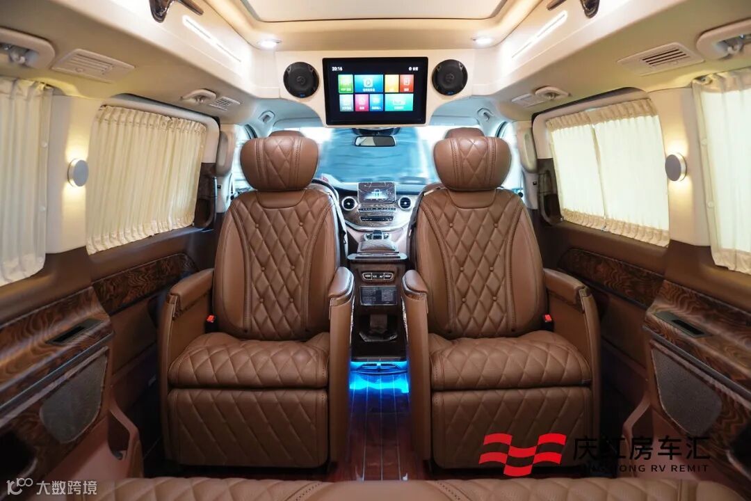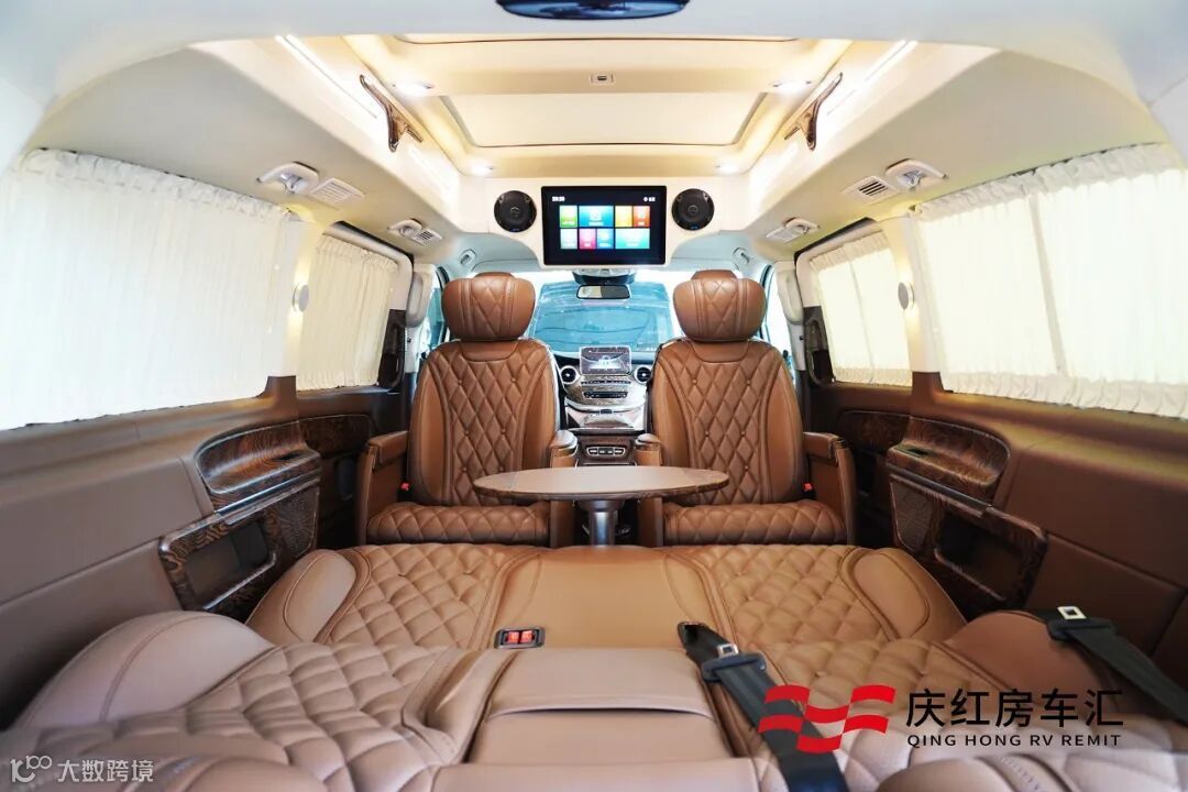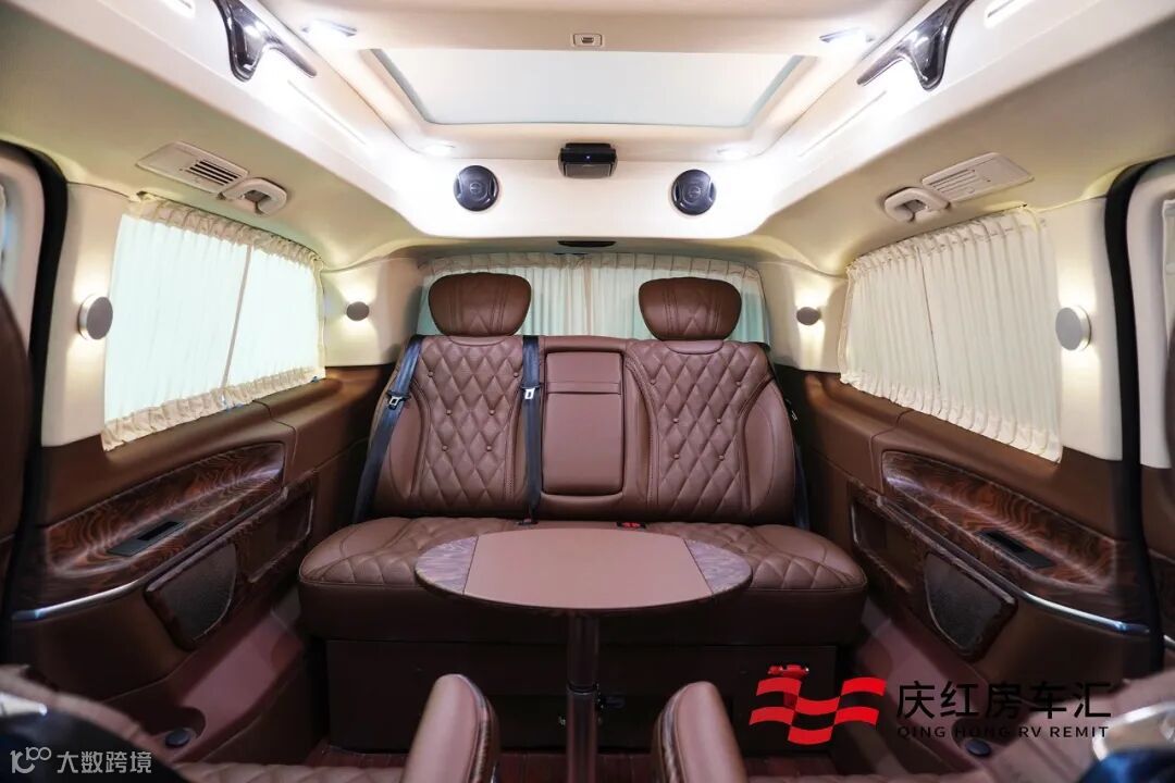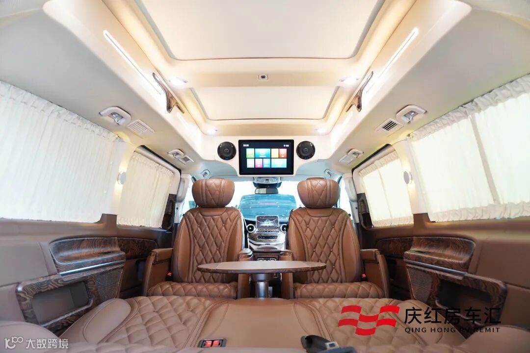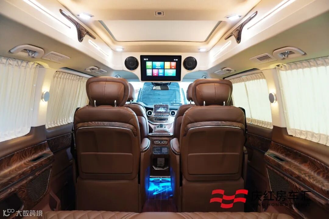 奔驰V级商务车内舱麂皮绒包覆车顶,光泽木地板,搭配舱内氛围灯,营造豪华明亮的车内环绕氛围。车舱内还配备高清液晶电视,阿尔派音响,功放带低音炮,可满足视频、音频多媒体播放,家庭出行休闲娱乐,心情愉悦。