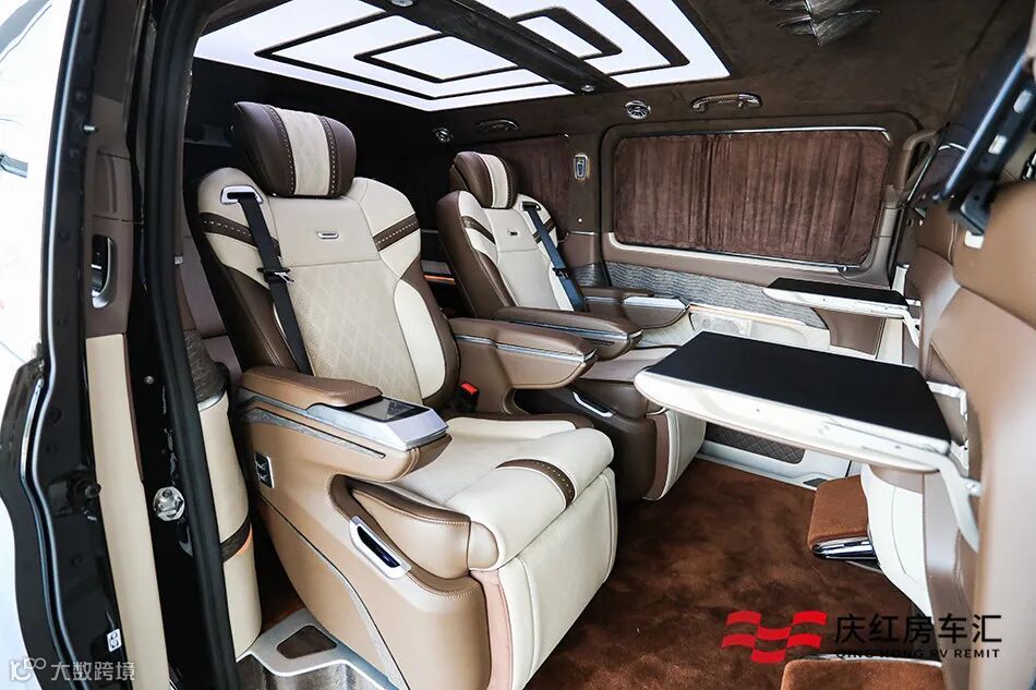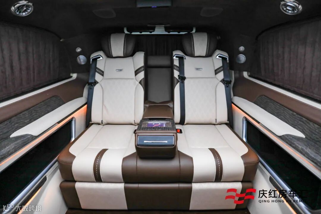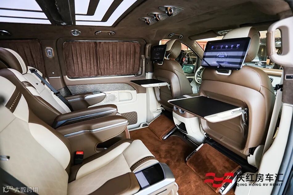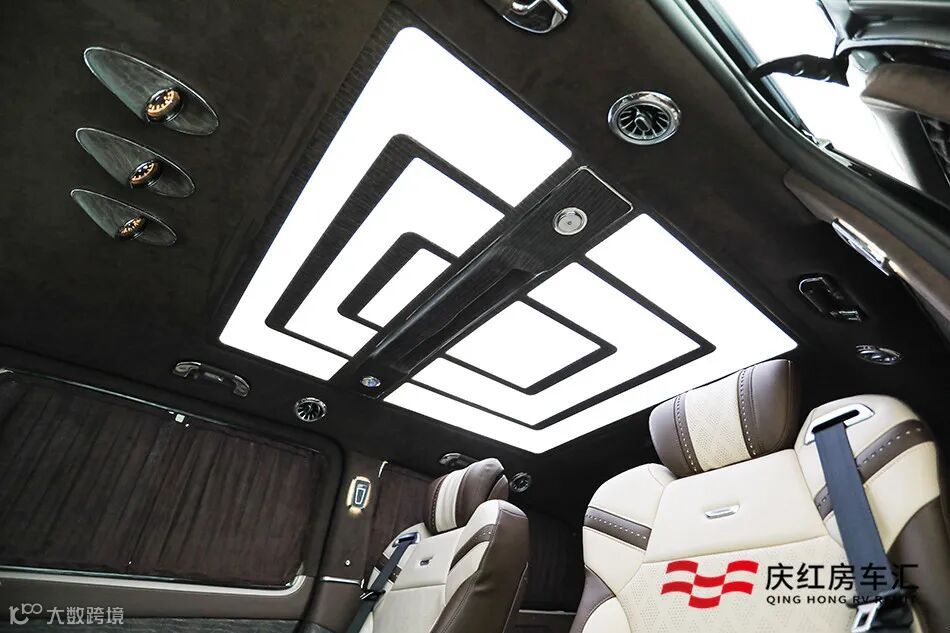 全新奔驰VS900L后舱采用咖啡色与米白色的撞色搭配,银檀木与橄榄木结合彰显高档的同时,还能隐隐感受的橄榄木的清香。顶棚采用回形水晶顶灯的设计,有效隔热不刺眼,结合内舱的氛围灯,彰显车内的高级质感。