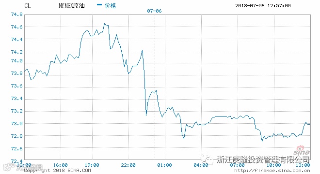 美国WTI原油8月期货周四(7月5日)收跌1.2美元,或1.62%,报72.94美元/桶。布伦特原油9月期货周四收跌0.85美元,或1.09%,报77.39美元/桶。美国原油库存意外增加,但库欣库存大降和美国产量维持不变为油价带来一定支撑,不过主要产油国的增产计划仍在推进,这令多头忧虑情绪加重。美国WTI原油期货价格盘中最低触及72.53美元/桶,布伦特原油期货价格盘中最低触及77.30美元/桶。