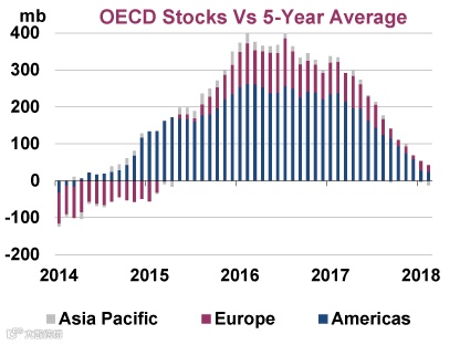 根据IEA的数据,2018年2月石油库存仅比过去5年平均水平高出3000万桶,同2016年巅峰时期比大降92%。而在2017年1月,这一数据还高达3.4亿桶。