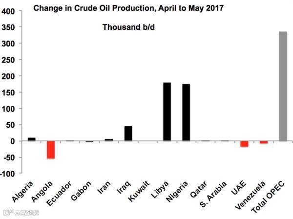 然而5月份,欧佩克原油产量为32, 139千桶/日,高于2017年第一季度的31,963千桶/日,但少于2016年第四季度的33,133千桶/日。避免石油减产,利比亚和尼日利亚已经占有优势,5月份解释了欧佩克的所有市场的意外收益。