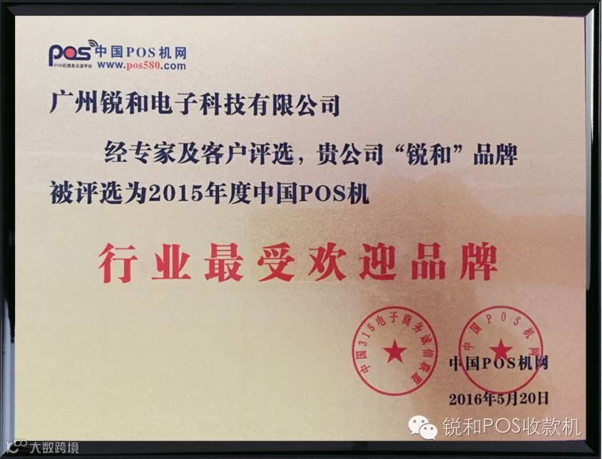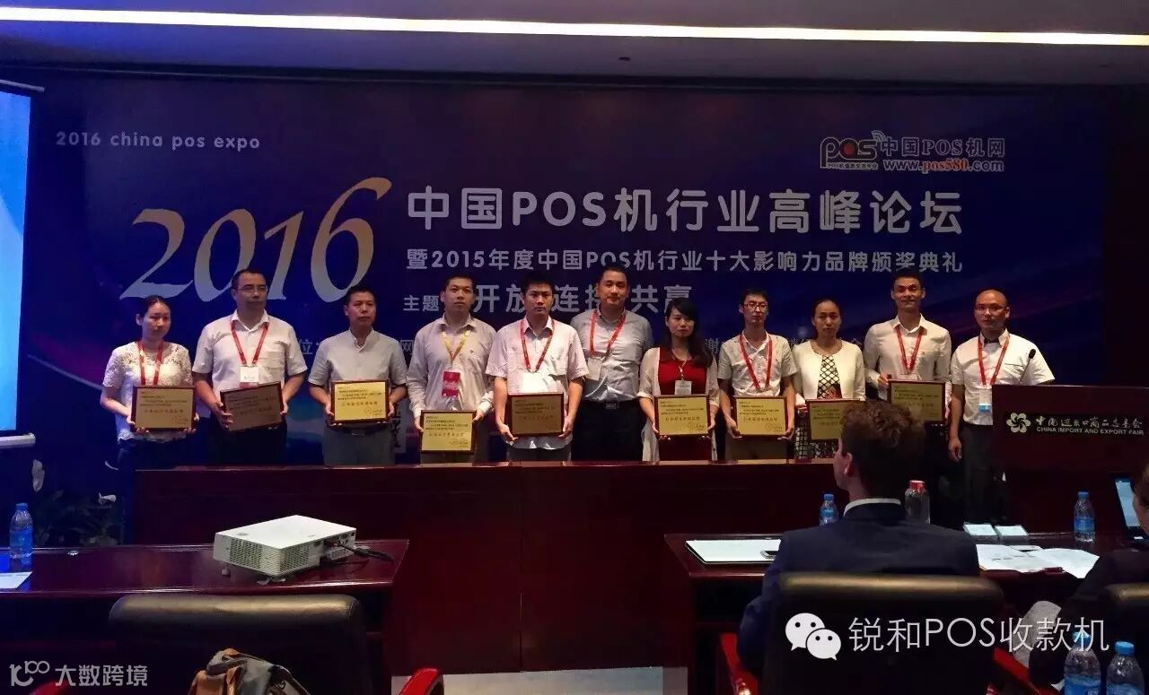 2016年5月20日,“2015年度中国POS机行业十大影响力品牌”颁奖典礼在广州琶洲会展中心隆重举行。历经100多天的公众投票,锐和入选中国POS行业最受欢迎品牌,5月20日受邀出席颁奖典礼及授牌仪式。