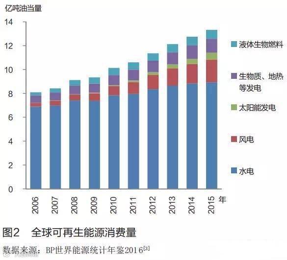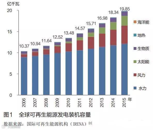 可再生能源在电力领域的应用最具代表性。 全球可再生能源发电累计装机容量从2006年至2015年年均增长7.49%。但其中也反映出非水可再生能源发电设备利用率低的问题。