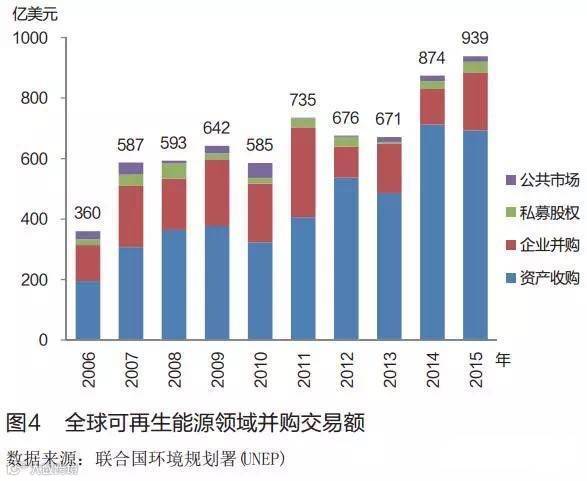 2015年, 全球可再生能源领域的并购交易总额达到历史最高值的939亿美元(见图4),从可再生能源类型来看,风能领域是并购交易的主战场,交易额比上年有增长;太阳能、地热、生物质与废弃物领域都有增长;液体生物燃料领域有降低,为历史最低值。