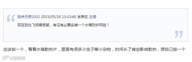 不论是自己动手还是买专业的防护网,只要安装,不仅能防絮,还能挡住飞进水箱散热片的飞虫,可谓一举两得。但要注意的是,安装必须要稳固,否则行车时会产生噪音。
