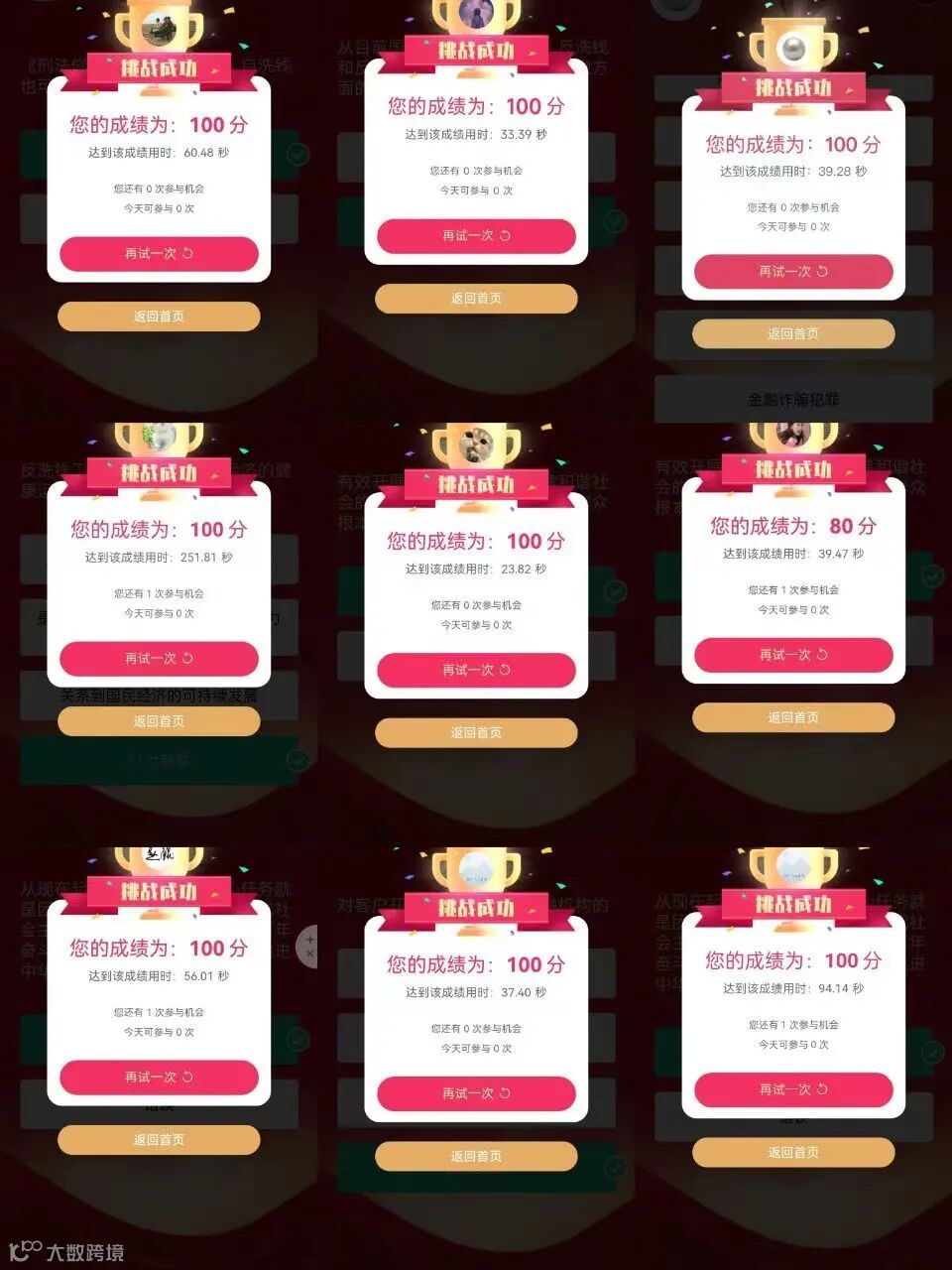 (二)答题晒分学习氛围浓厚。本次“山东省第二届反洗钱知识网络竞赛”答题活动开展对员工养成反洗钱常工作态化习惯具有较高的学习价值和推动意义。临沂中支从上至下高度重视此次答题活动,精心组织,每日进行答题情况追踪。各业务条线充分利用微信群宣导、线上早会督促等形式积极开展,活动过程中,对于部分外勤员工使用智能手机不熟练的情况,内勤员工有针对性地开展帮扶,协助并追踪外勤答题情况。员工答题结束后积极在微信群中截图晒分,营造出了“比学赶超”的浓厚氛围。
