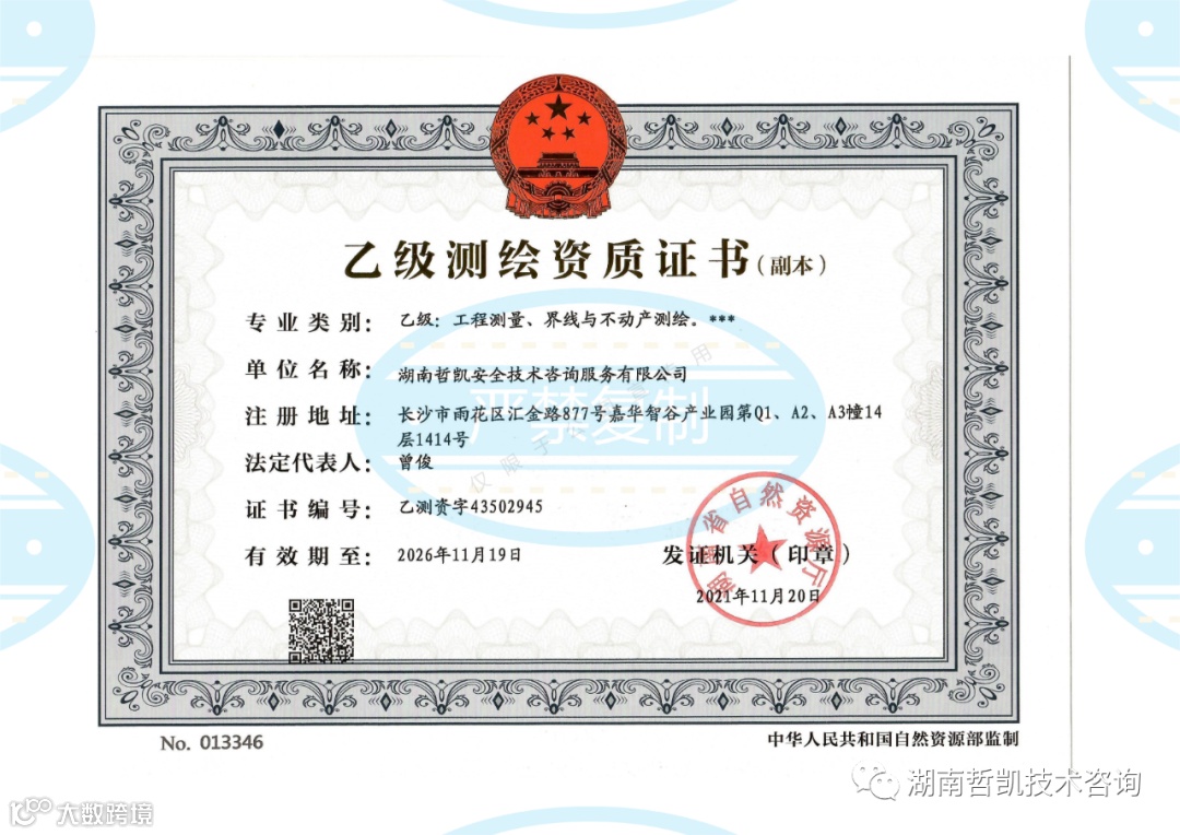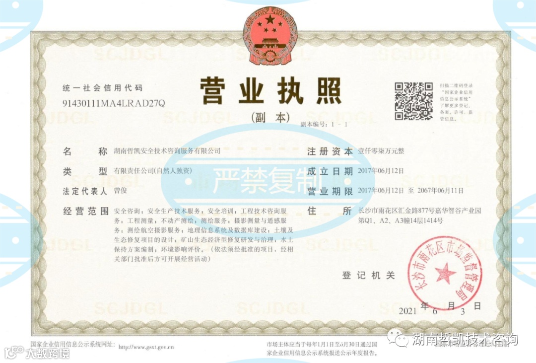 湖南哲凯安全技术咨询服务有限公司成立于2017年6月,注册资本1007万,公司位于长沙市雨花区嘉华智谷产业园(长沙屿)A3栋14楼,公司拥有采矿、地质、测绘、注册安全工程师、安全评价师等多种专业技术人员。