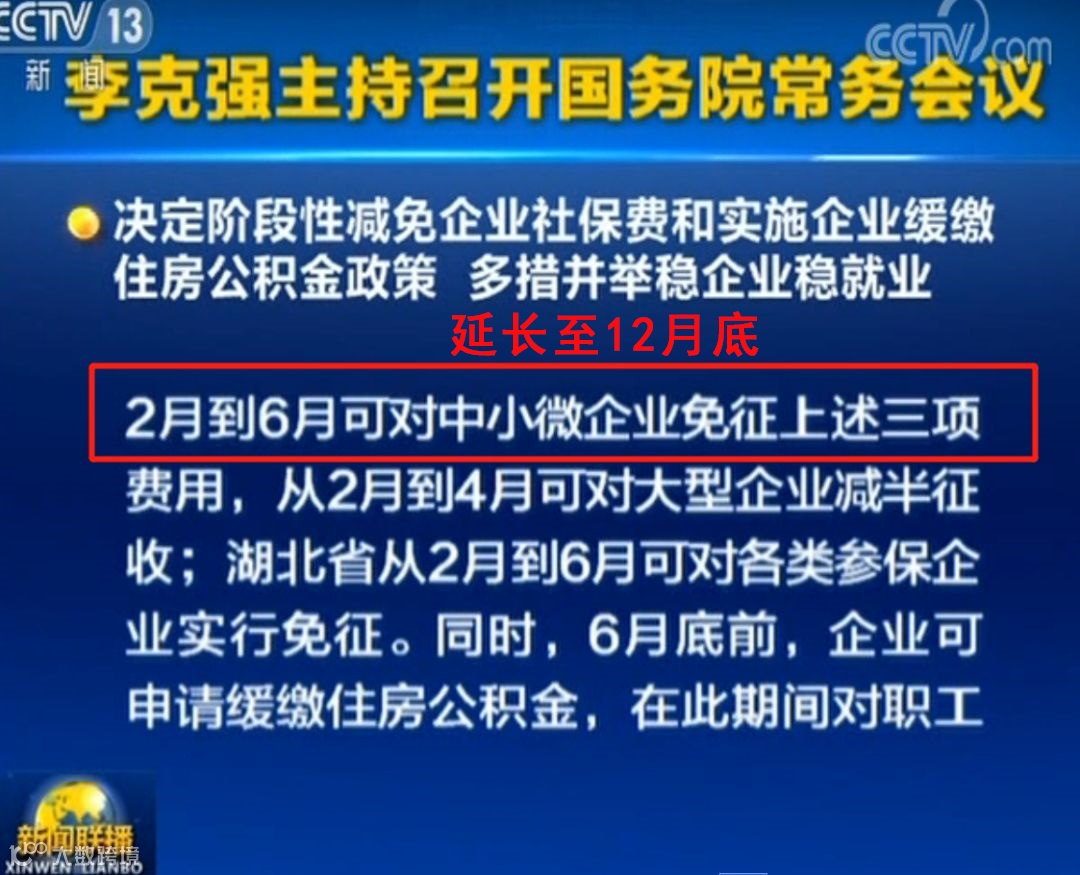 2、前期出台6月前到期的减税降费政策,包括免征中小微企业养老、失业和工伤保险单位缴费,减免小规模纳税人增值税,免征公共交通运输、餐饮住宿、旅游娱乐、文化体育等服务增值税,减免民航发展基金、港口建设费,执行期限全部延长到今年年底。