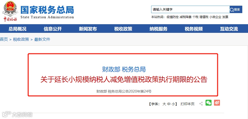 小规模纳税人减免增值税政策延长到2020年12月31日!