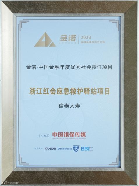 信泰保险“浙江红会应急救护驿站项目”荣膺“金诺·中国金融年度优秀社会责任项目”