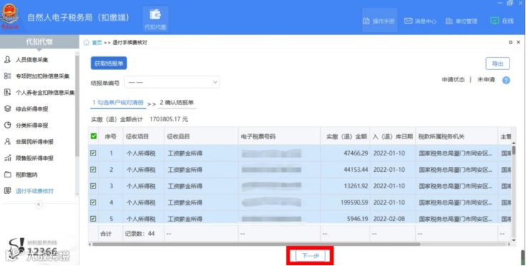 2、首页功能菜单【单位办税】下,点击左侧菜单栏【扣缴申报】子目录下的【退付手续费核对】,点击自动弹框【确定】后,进入【退付手续费核对】页面,系统自动带出单户核对清册。