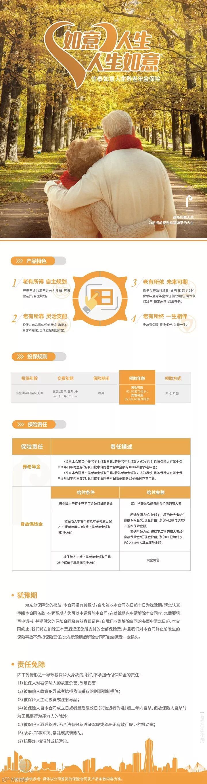 信泰如意人生养老年金保险作为一款后发产品,全面考虑到了客户在不同阶段的养老保障需求,并进行了有针对性的产品功能设计,能够帮客户很好地规划和享受自己的未来。它可以实现养老年金领取年龄自主规划,按需选择(男性领取年龄可选:60/65/70,女性领取年龄可选55/60/65/70),还可以在投保时选择年领或月领的方式,灵活支配,如意随心。而且自年金开始领取日(含当日)起的25个保单年度为年金保证领取期间。
