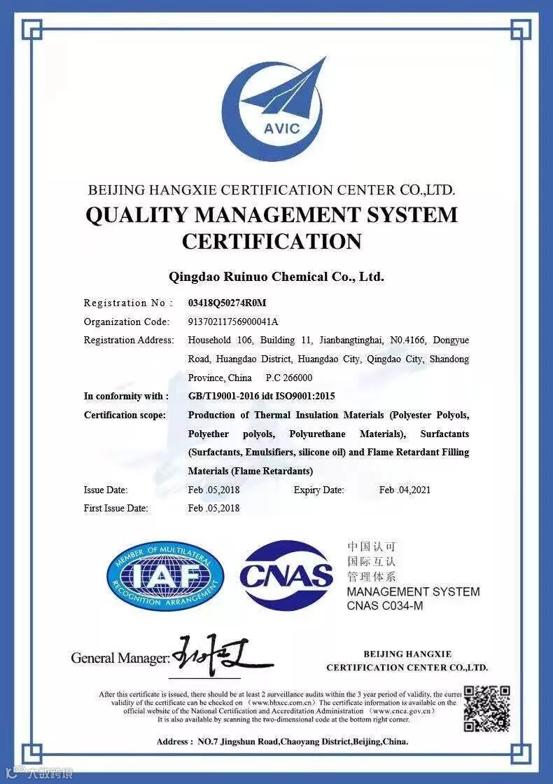 青岛瑞诺化工有限公司于2003年初诞生于青岛市黄岛区,瑞诺公司专注于聚酯多元醇、聚氨酯阻燃剂、油酸钾和油酸钠、以及表面活性剂等环保型产品的研发创新、生产经营与持续发展。