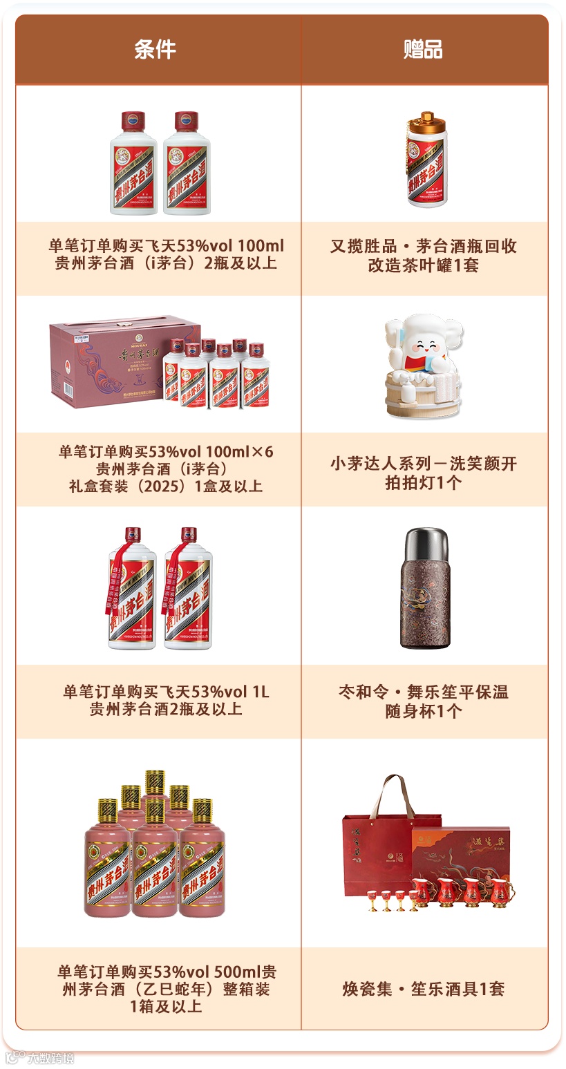 活动期间,亲们在i茅台APP“臻品茅台贺佳节 购酒好礼映团圆”活动页面购买以下指定产品,确认收货后可获赠对应精美礼品,多买多赠~
