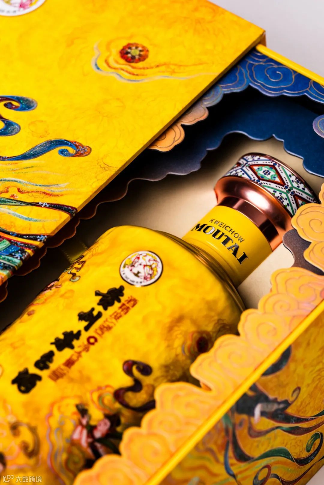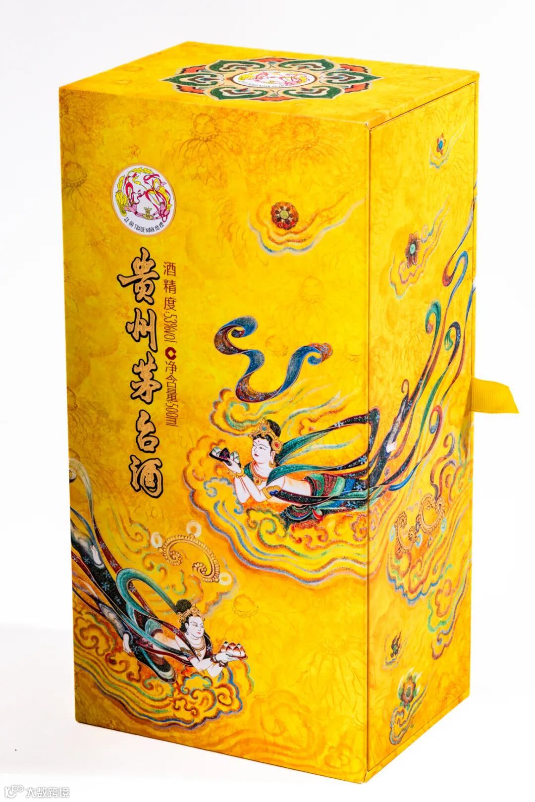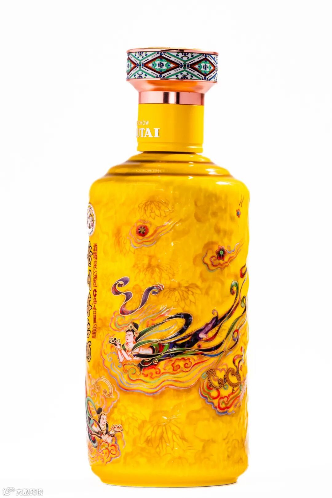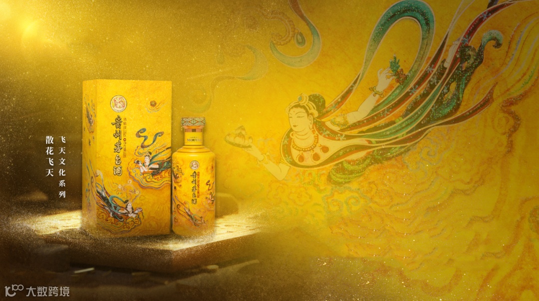 在设计上,散花飞天的包装以敦煌壁画中飞天仙女元素为创作主轴,采用手绘方式,展现唐代飞天造型优雅华贵及空灵飘逸的姿态。彩盒内部以双层云彩造型装饰,酒瓶采用经典茅型瓶,以全新陶瓷工艺、釉下彩、岩彩画风格烧制而成,呈现出与敦煌壁画一致的矿物质陶瓷手感,让产品文化与敦煌壁画相融相生,极具文化价值和审美艺趣。