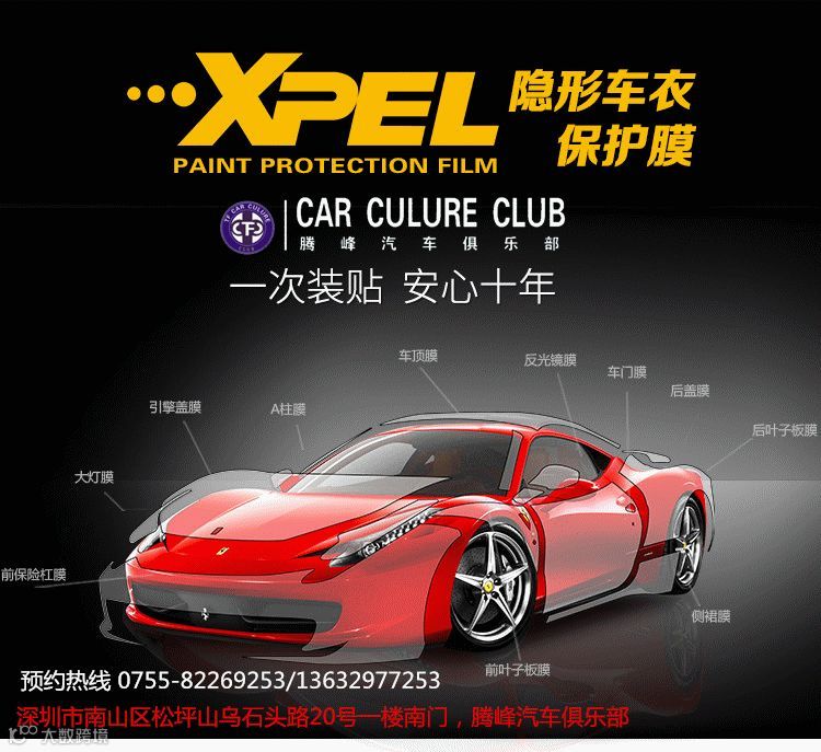 深圳腾峰汽车俱乐部成立于2006年,是一家拥有12年专业汽车玻璃贴膜、车身隐形车衣(美国XPEL)、改色膜等专业汽车服务企业。公司不断开拓创新,拥有一流的专业管理团队,及专业技术精湛的贴膜技师团队,和一支有厂方支持的优质售后服务团队,均接受过并且通过各品牌汽车膜总部专业的技术培训和技能考核。从根本上解决客户在购前,购中和购后的一切问题,真让做到让客户放心,省心,安心。