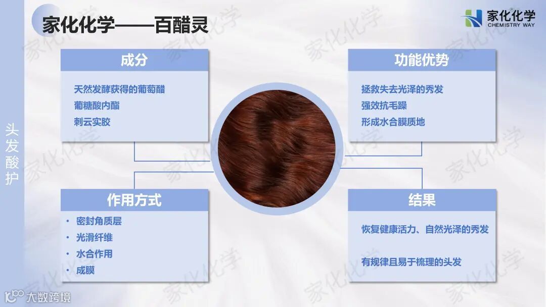 此外,孙博士还分享了另一款用于头发酸护的原料——百醋灵。这款原料由香脂醋、α-多羟基酸、糖类和多糖等组成平衡系统,能使头发的 pH 恢复平衡,促进强烈水合,使蛋白质原纤维整齐排列,闭合毛皮质,使头发柔软有光泽。