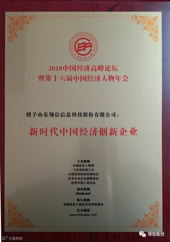 在本次会议中共设11个奖项,领信股份荣获“新时代中国经济创新企业”奖项,李鹏董事长个人荣获“新时代中国经济优秀人物”奖项。