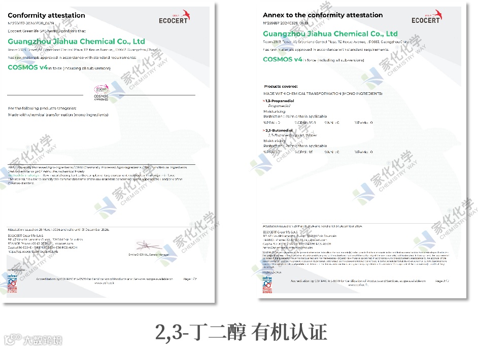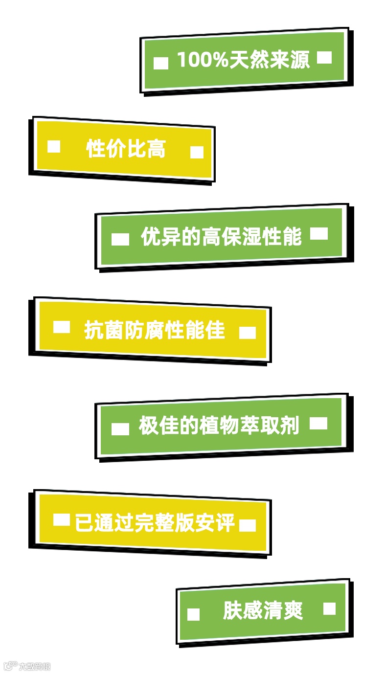 生产过程绿色无污染,原料来源可持续,已获得cosmos天然认证,与当前倾向使用绿色、可持续或生物基来源化妆品原料的大趋势相吻合。