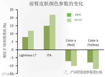 使用安慰剂和含有 3% NIO-OXY膏霜进行体内测试,涂抹于志愿者前臂内侧,持续28天后发现有明显的美白功效和亮肤效果。