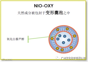 NIO-OXY中的囊泡系统由两亲分子构成,中心由一个水相空腔构成,其周围是一个或多个由两亲分子构成的双分子层,亲水药物可以包封于水相空腔内,亲脂药物可以与双分子层结合。NIO-OXY核心功效成分是桑提取物,其中的氧化白藜芦醇具有美白亮肤的作用。相对于传统脂质体,变形囊泡具有更好的弹性,因此能够穿过角质层的孔隙(20nm),提高氧化白藜芦醇在角质层的渗透性,从而实现美白目的。