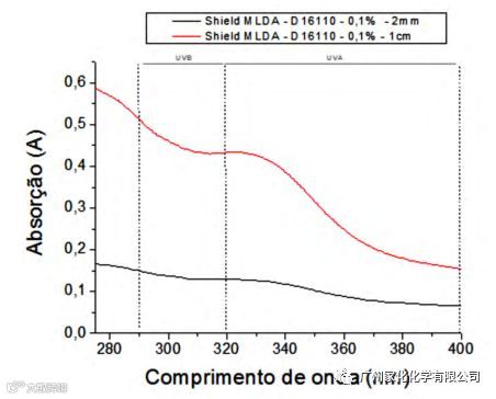 0.1%的Shield MLDA乙醇溶液对UV的吸收,光程为1 cm和2 mm。实验结果表明,Shield MLDA可吸收UVA、UVB和UVC。