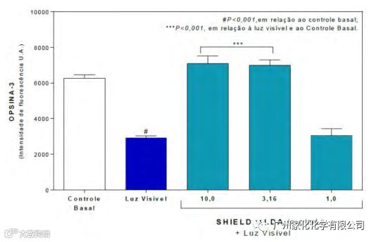 对培养的人角化细胞进行蓝光辐射处理,通过对视蛋白-3(opsin-3)合成的影响评价产品的预临床功效。用Shield MLDA处理后荧光标志物视蛋白-3(opsin-3)的荧光强度显著增加(141%),表明其对蓝光具有预防性作用。