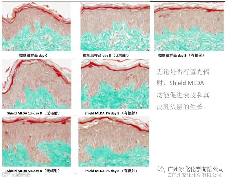 体外测试:在人皮肤外植体中评价Shield MLDA的抗蓝光效果。运用:啫喱 1 – 5%。