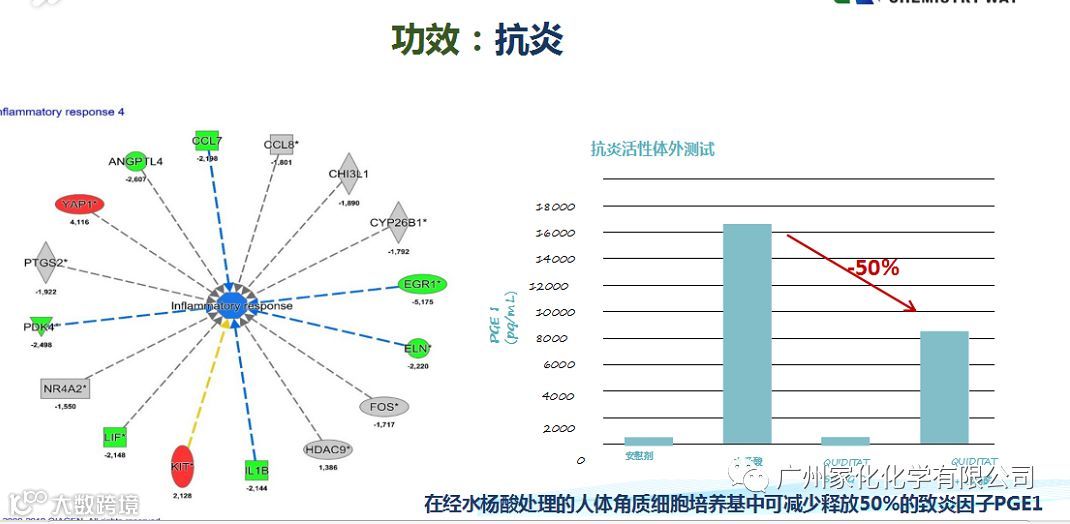 B使用Qiagen®的生物通路分析软件IPA分析藻敏舒对刺激状态下表皮角质形成细胞和成纤维细胞的影响。基因表达测试结果显示藻敏舒可能在肌肤表皮和真皮层产生强大的活性促进人表皮角质形成细胞和纤维组织母细胞中507条基因的表达。