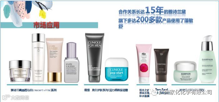 雅诗兰黛与ASSESSA达成长达16年的合作,雅诗兰黛市场上超过200款配方使用了藻敏舒SR. 现在给各位列举了一小部分实际应用了藻敏舒SR的市售产品。