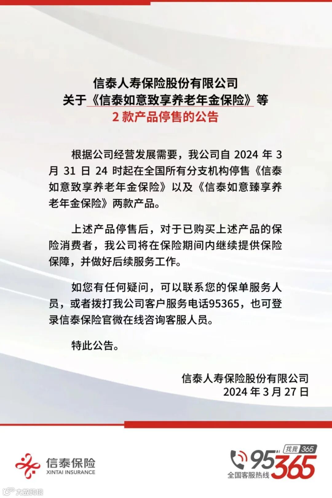 关于《信泰如意致享养老年金保险》等2款产品停售的公告